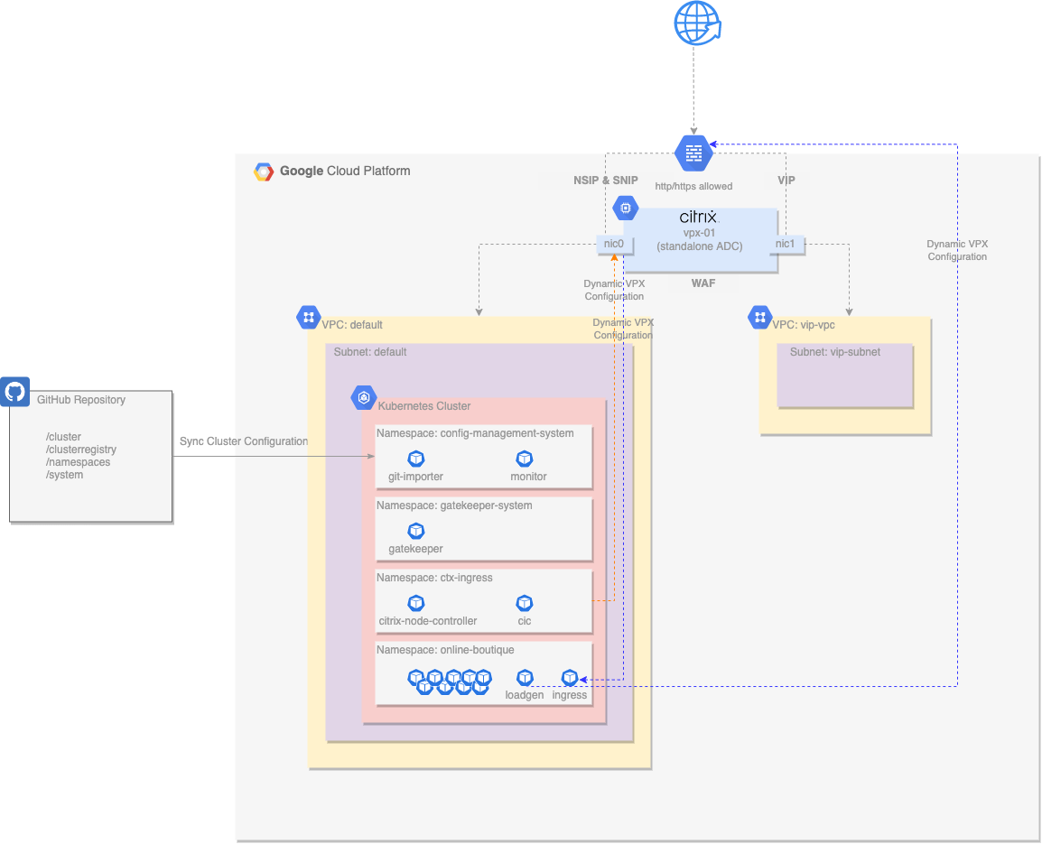 Here, we’ll focus on deploying a Tier-1 NetScaler (VPX) in front of a Google Anthos GKE cluster within GCP. We will leverage Google Anthos Configuration Management for consistent deployment of NetScaler components into the Anthos GKE cluster. Additionally, we’ll leverage Google Anthos Policy Controller to ensure that NetScaler Web App Firewall configurations exist to protect ingress objects within a cluster.